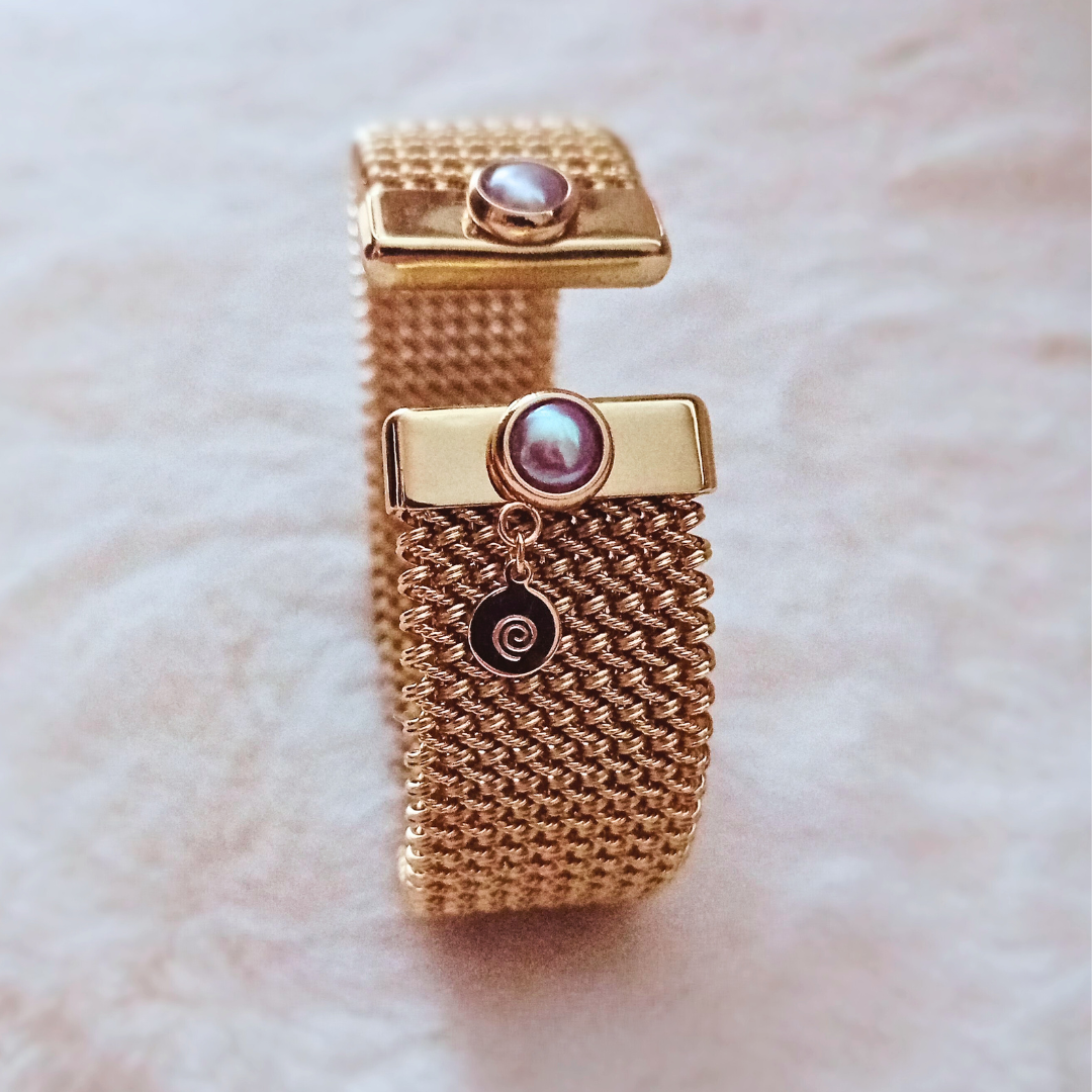 Mjuka kurvor möter en tydlig struktur i ett armband där formen får stå i centrum. Den böjda silhuetten smyger sig fint längs handleden och skapar ett smycke som känns naturligt att bära, från vardag till mer uppklädda tillfällen.
