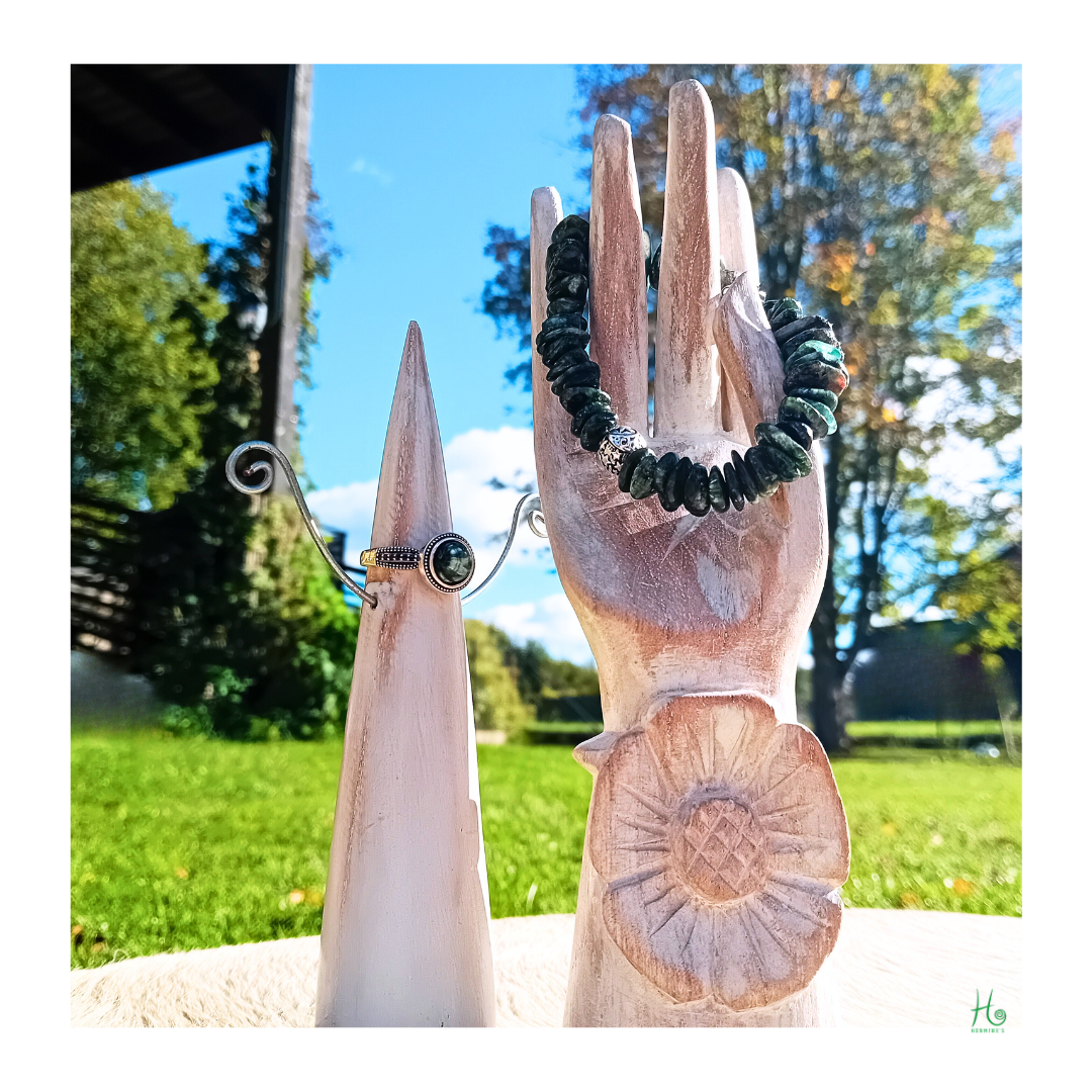Serafinit-kristallen skimrar i drömlika gröna och silvriga toner - som om ljuset dansar på dess yta. Varje serafinit-sten är en unikat och bär sitt eget levande mönster vilket gör ringen till en personlig följeslagare.