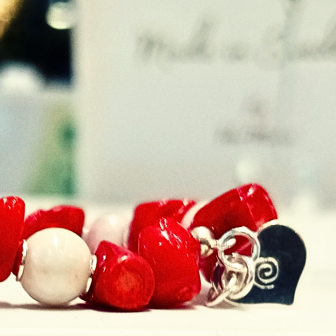 Designen är enkel men uttrycksfull: rött mot ljust, organiska former mot rena silverdetaljer. Ett armband som bär färg med självklarhet.