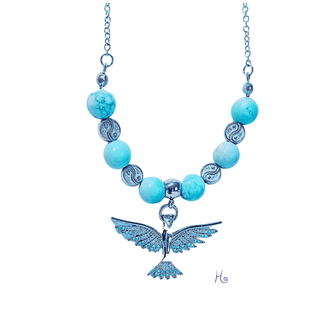 Den visuellt attraktiva fenixstenen med sina himmelsblå- turkosa pärlor möter sval elegans i rostfritt stål.