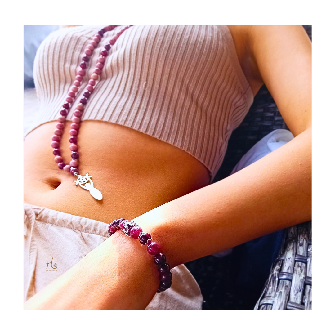 Kärleksfull handknuten mala med 108 pärlor i 8 mm storlek – i en djup färgkombination av rodonit och vinröd granat. Ett vackert och stabilt gudinnehänge i polerat rostfritt stål (spegeleffekt) avslutar smycket tillsammans med matchande distanspärlor och logohänge.