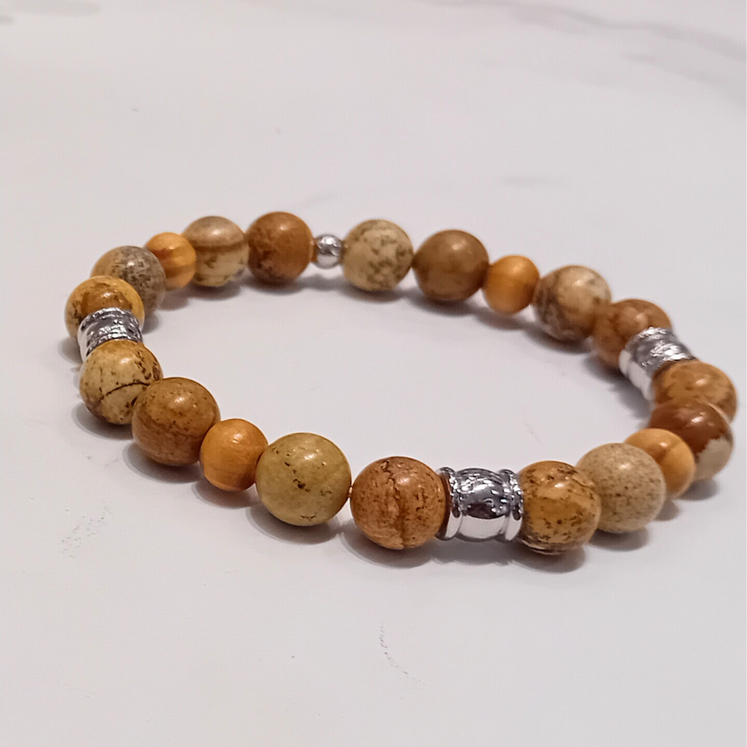 Ett modernt armband i varma jordtoner med landskapsjaspis och detaljer i rostfritt stål. Stenarnas naturliga mönster gör varje armband unikt och ger en lugn, maskulin look som passar lika bra till vardags som på resa, jobb eller fritid. Med wooden pearls som distans.