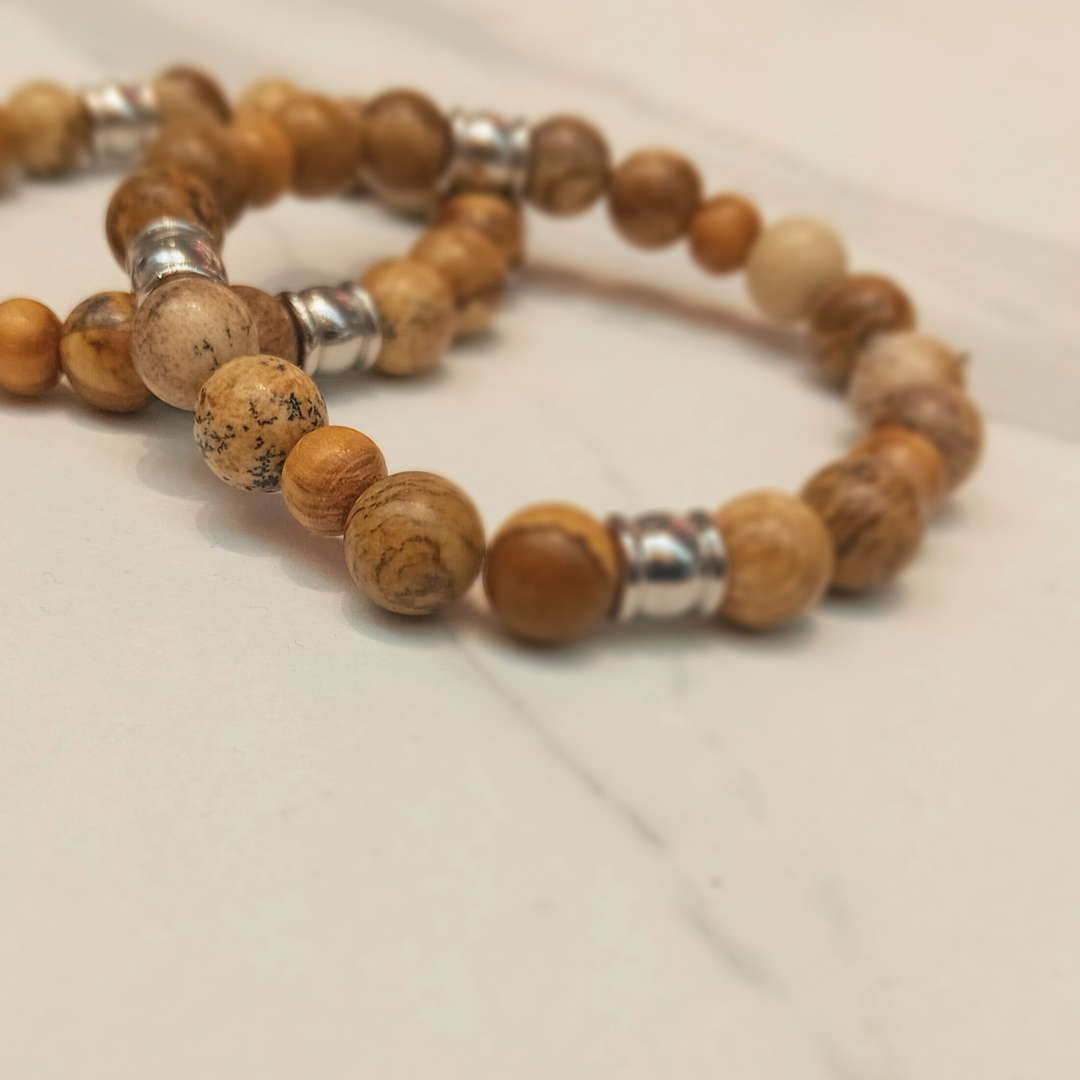 Armband i landskapsjaspis med rostfria detaljer – varma jordtoner, tidlös känsla