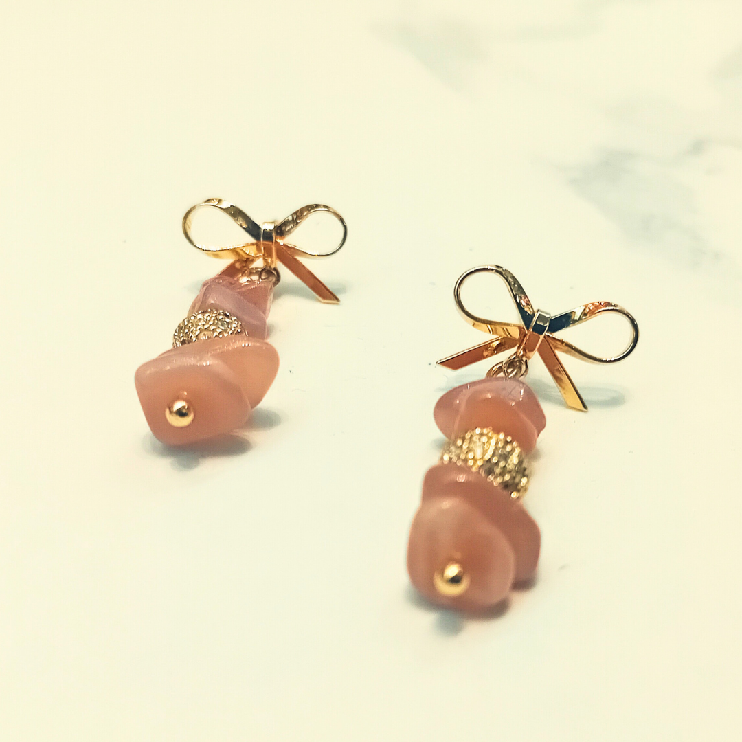 Ett par eleganta örhängen med solsten i mjuka, persikorosa toner, kombinerat med cubic zirkonia och 18k guldpläterade komponenter. Den lilla rosetten ger en feminin signatur och gör örhängena både lekfulla och lyxiga på samma gång.