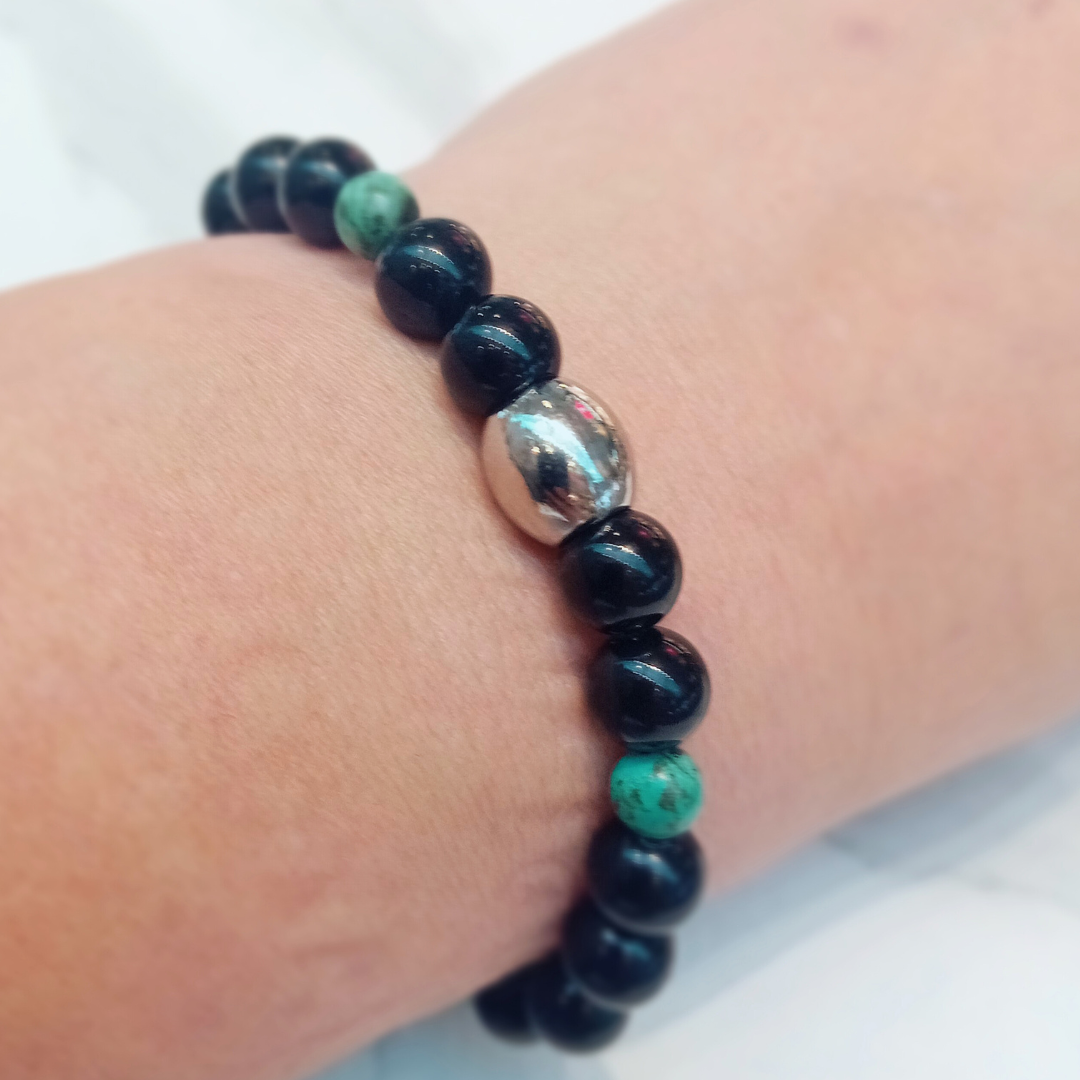 Ett armband med svart obsidian i 8 mm och matt afrikansk turkos i 6 mm, kombinerat med en polerad mittpärla i rostfritt stål. Kontrasten mellan djupsvart och grön ton ger ett modernt uttryck som känns rent, maskulint och lätt att bära varje dag.
